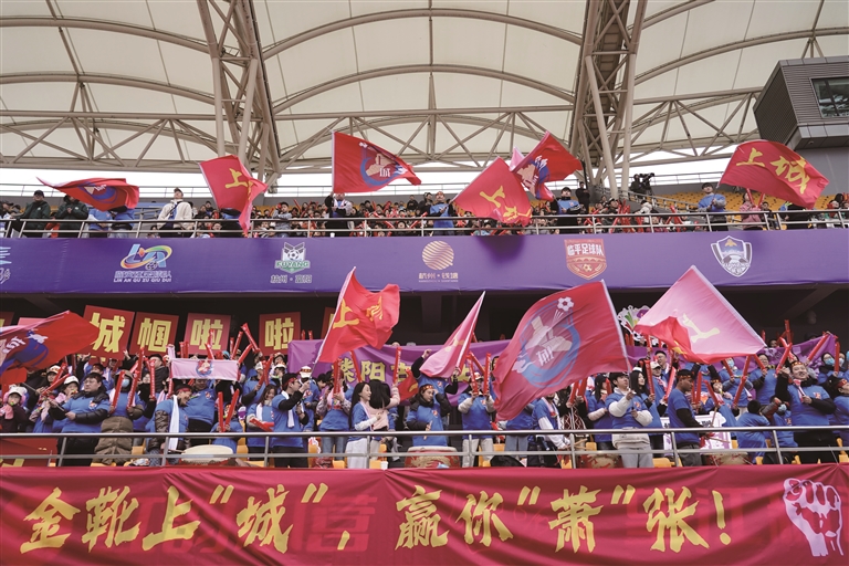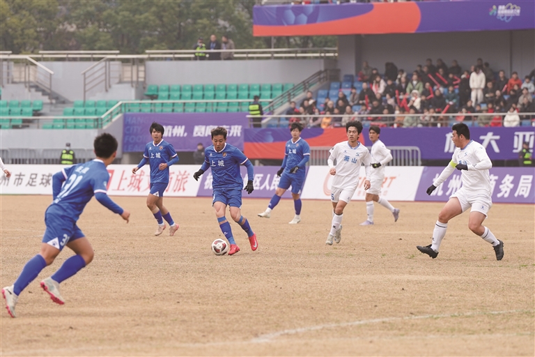 昨天上午,2026杭州城市足球联赛暨第三届杭州市足球协会杯赛在上城区体育中心体育场揭幕。本次赛事共有13支球队参与,分为A、B两个组,赛事时间跨度将近三个月。揭幕战由上城队与萧山队打响,最终上城队以4:0取得开门红。图为昨天上城区体育中心体育场上城队对阵萧山队的比赛现场。