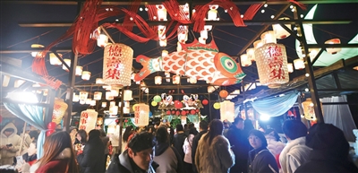 市集上还有热乎乎的驴打滚、甜滋滋的糖葫芦、冰雪可爱的白兔灯等小吃和手作,而在灯火阑珊中,等一场人造雪,打卡辛弃疾《青玉案·元夕》中的场景,也是一种玩法。