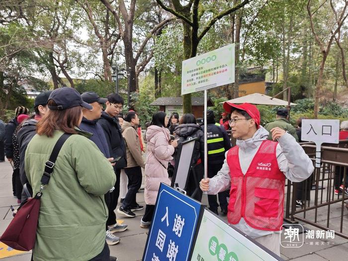 景区外围的灵竺路上,拉起百来米长的铁马护栏,隔出一个人车分流的通道。在这个通道入口卡口处,有保安和志愿者正在查验入园预约凭证,地上还有一块绿色告知牌,温馨提醒“自2月1日起,不再受理现场登记”,现场广播滚动播放、反复提醒。