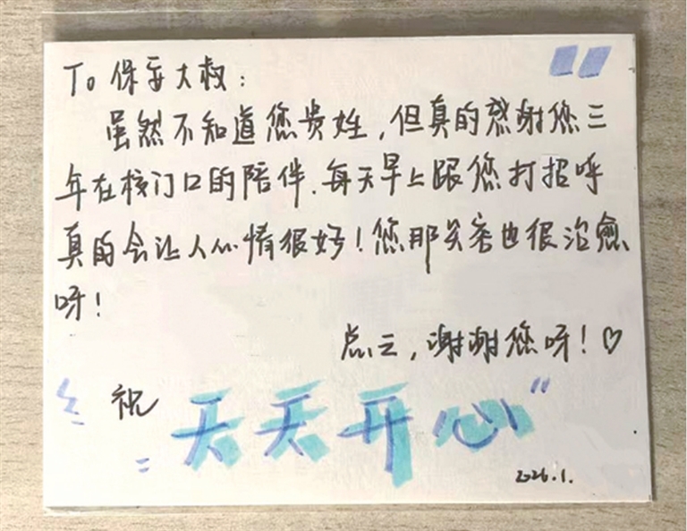“虽然不知道您贵姓,但真的感谢您三年在校门口的陪伴。每天早上跟您打招呼,真的会让人心情很好!”1月中旬,杭州市景芳中学的保安方子善收到了一张学生手写的暖心卡片,稚嫩的字迹、真诚的话语,让这位坚守校门多年的保安师傅心里暖意融融。