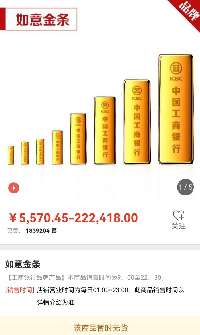 记者随后查看工行app后发现,其销售的如意金条和大师十二生肖传世金销售页面均已显示为售罄状态。