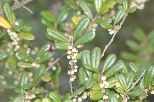 格药柃的名字,来源于它的雄花花药上有多个“分格”。格药柃也是冬季重要的蜜源植物,因其植株形态与桂花略有相似,它的花蜜又被称为“野桂花蜜”。每年6–8月,格药柃会结出紫黑色的浆果,是许多鸟类喜爱的食物,种子也随着鸟粪传播到更远的地方。