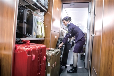 列车长钱佳搬运整理旅客的行李箱,避免挡住通道。