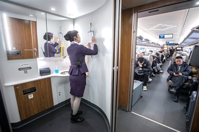 列车员拿着“保持安静”的提示牌在静音车厢内巡视提醒。