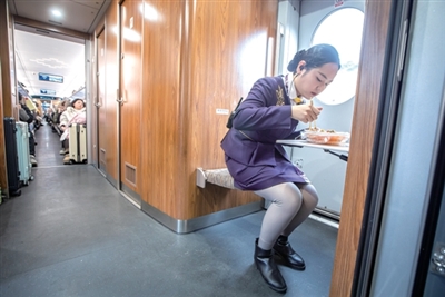 昨天下午2点半,一名列车员坐在车门处的乘务员专座吃午饭。