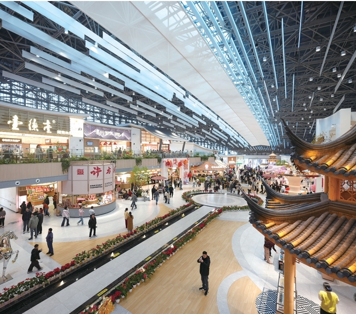 最热闹的一定是中央舞台,春运期间,这里白天古筝演奏、川剧变脸等轮番上演,春节假期还有鱼灯巡游、红包墙互动,就连孙悟空和功夫熊猫都会出来走秀,陪孩子们合影玩闹。鱼灯和红灯笼装扮的国风打卡点前,年轻人举着手机,匆匆归家途中截下一帧年味。