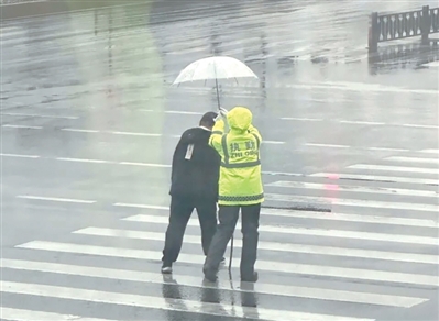经常路过此处的周先生说,有一天下着雨,他看到一个拄拐杖大哥过马路,女警打着伞一直慢慢陪着他走。