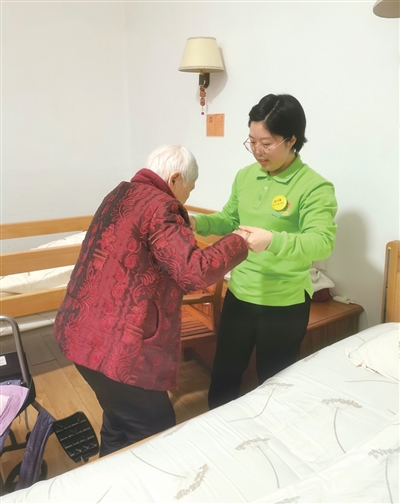 徐兴春(右)在辅助老人下床运动