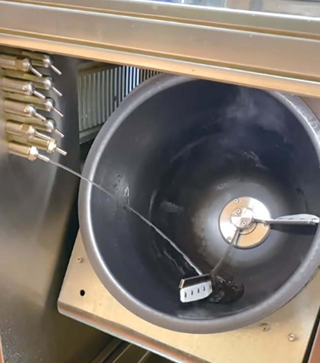 炒菜机有个操作台,下面是炒锅,转起来像斜放的洗衣机滚筒,旁边10个调料出口,每个水龙头般大小,可以喷出香油、蚝油、酱油、陈醋、水、料酒等。