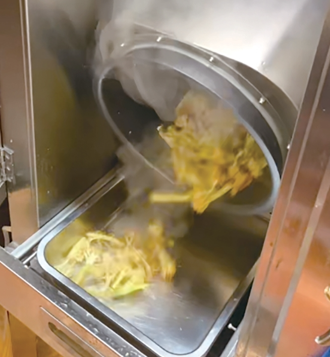 炒菜机工作时,食堂学厨工小王一直在旁边观察。