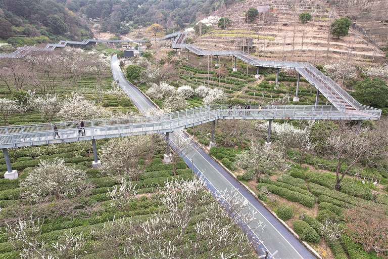春分节气将至,萧山所前镇三泉王村千亩李花竞相绽放,洁白的花朵缀满枝头,勾勒出“半山李花满山雪”的诗意春色。
