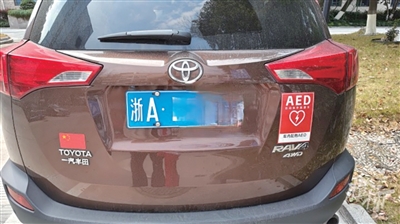 “我在杭州武林门、滨江和临安都看到过私家车配有AED的标志,一般贴在后备厢、后窗玻璃或汽车侧面,还有车主把电话号码写在标志上。”