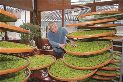 昨天,西湖龙井茶一级保护区翁家山的一片龙井茶茶园里,一部分龙井茶43品种春茶长势喜人,有的茶芽已长至2.5cm-3cm,可零星采摘。据相关部门研判,今年西湖龙井43号将于3月19日(今天)正式采摘,群体种将于3月底开采。图为昨天,翁家山村,茶园主人李水中提早迎来采摘日,正在给刚采摘的龙井43品种春茶摊青。
