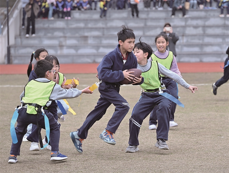 昨天,江南小学第二届腰旗橄榄球“班超”联赛开赛。来自该校三年级的10支参赛队伍将在赛场上一较高下,绽放少年风采。