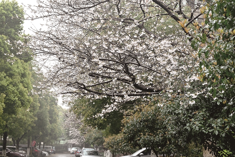 春日里,萧山新塘街道泰和花园东区的樱花竞相绽放,洁白似雪,绚烂迷人。