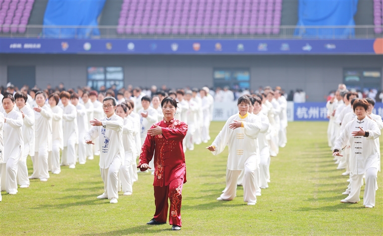在萧山区体育总会和武术协会的牵头统筹下,全区62个太极拳辅导站组织了千余名太极拳爱好者、教练员、运动员,涵盖从青少年到老年全年龄段,展演24式简化太极拳、八法五步、健身气功八段锦等八大项目。