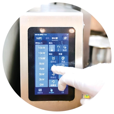 一台在炒香辣猪脆骨。主厨邓旭辉把切好的青红辣椒和猪脆骨倒进炒锅,手指在操作屏上轻轻一点,锅里的油温快速上升。火力数值从3千瓦跳到15千瓦,炒锅开始有节奏地摇摆。大约两分钟,一道辣炒猪脆骨就出锅了。