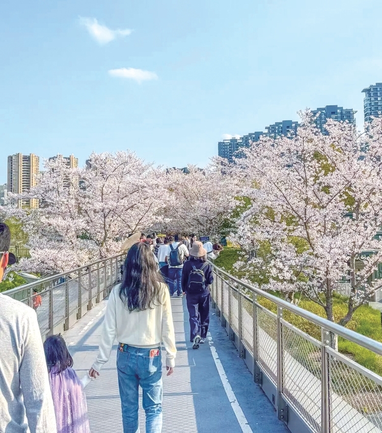 眼下,拱墅运河体育公园里的天桥,已经成为杭州赏樱的好地方。500米长的天桥两侧,种了100多株染井吉野樱,树冠交织在一起,像撑起了一片粉白色的穹顶。