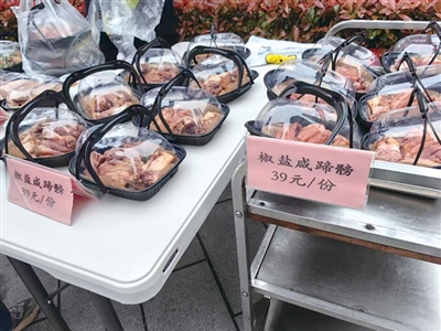 记者下午3点50分来到莲花宾馆,骑电瓶车、自行车来的市民不少。39元/份的椒盐咸蹄髈很受欢迎,放在最显眼的位置。服务员告诉记者,这是今年推出的新菜,都是现炸,现在还有余温,回家热一热就可以,一天要卖80份。