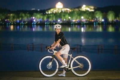 趁着炒茶间隙,张钰在西湖边夜骑。