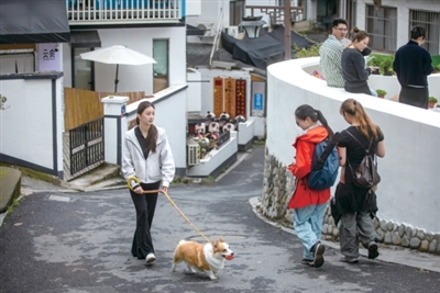 满觉陇四眼井,张钰在遛宠物狗。