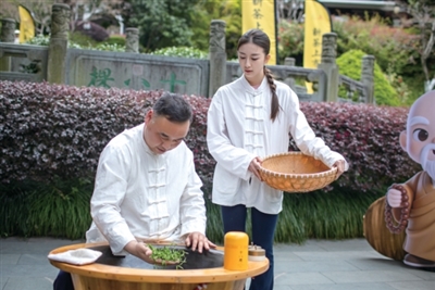 张钰跟着师父周建军炒制西湖龙井