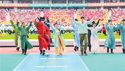 汪顺、王懿律、郑思维、石智勇、管晨辰五位奥运冠军也来到了现场,他们身着汉服同框,共同为“吴越杯”加油助力;中国足坛名宿范志毅还秀起了脚法,国脚王钰栋更是和身着武侠古风装的机器人“冲冲”一同开球,全场球迷同欢呼,星味、