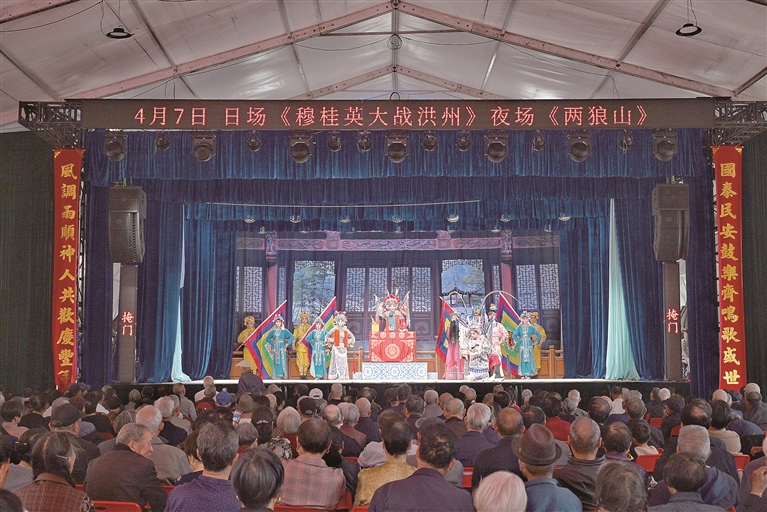 近日,所前镇金临湖村举行华氏宗祠落成专场演出,村民在家门口看绍剧大戏。
