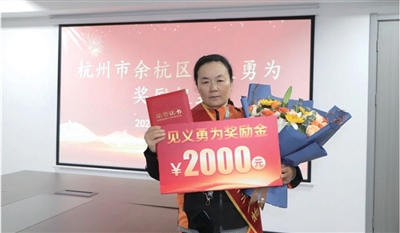 4月14日下午,余杭区见义勇为基金会会同良渚派出所举行见义勇为奖励仪式,对外卖员梅厚菊进行了表彰。