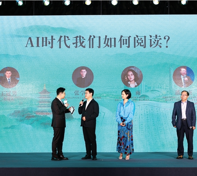 阅读沙龙环节邀请到了中国移动咪咕数字传媒有限公司总编辑张学伟,杭州岸墨影视传媒有限公司创始人曹雨,北航杭州国新院元宇宙与具身智能实验室主任、浙江省人工智能学会智慧文旅分会会长潘志庚带来《AI时代我们如何阅读》的探讨,共话技术赋能下阅读的变与不变。
