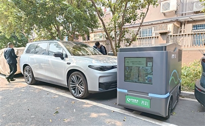 业主韩先生的零跑也正在用“移动储充机器人”充电。韩先生说,他家有两辆电车,平时都在单位充电。