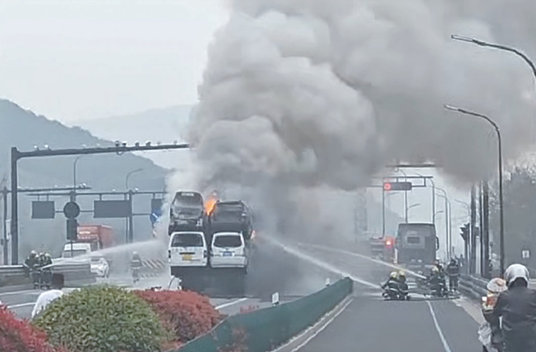 富阳春永线上 载二十辆二手车的大型拖车剧烈燃烧